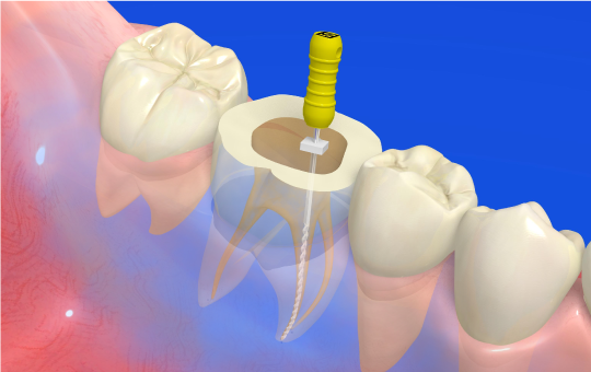 歯の神経の奥にまで達してしまった重度のむし歯治療として、なるべく歯を残せるよう根管治療を行います。すでに神経を取った歯でも、根の中に細菌が進入すると酷い痛みや腫れが生じて歯を支えられなくなってしまうため、感染物質を除去するために、根管内を洗浄殺菌消毒します。
